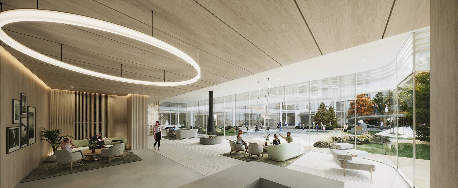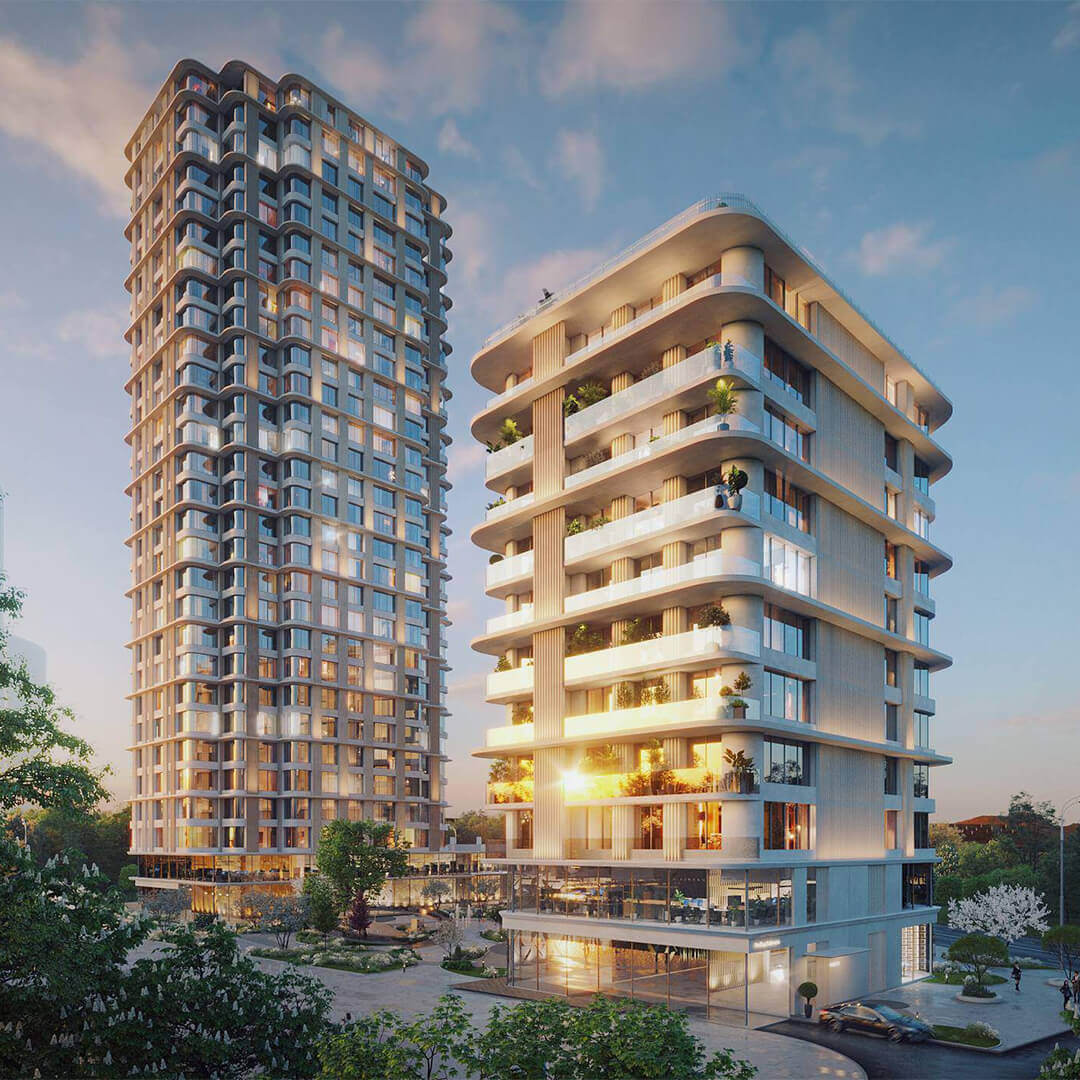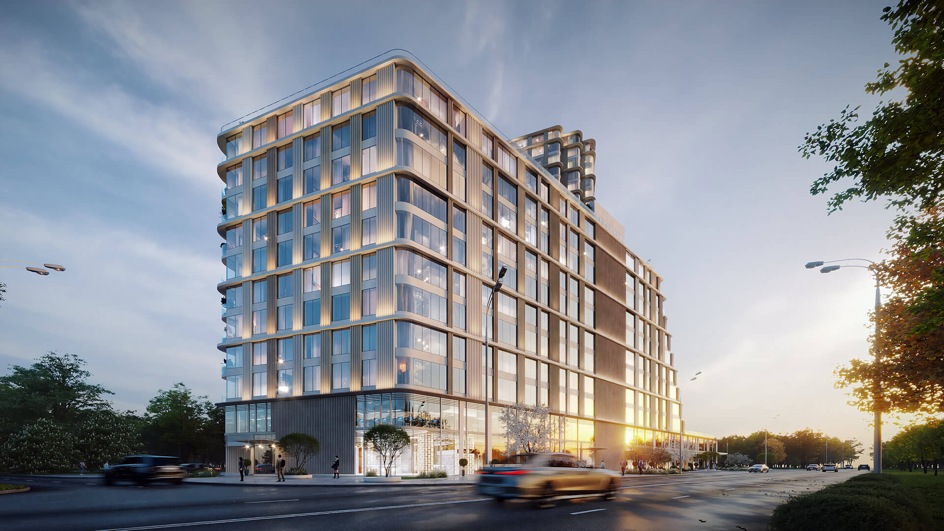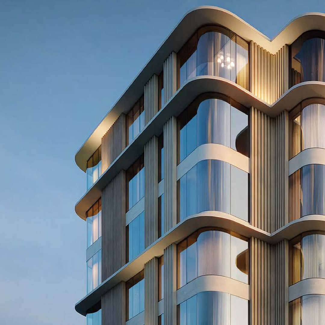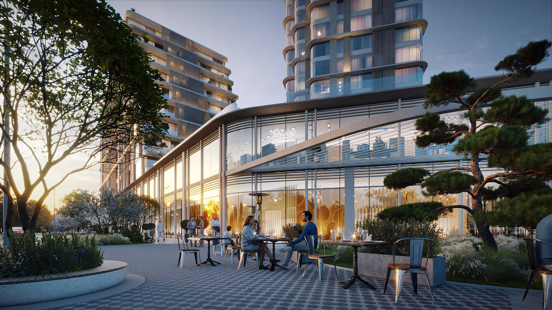 Скругленные углы и бесшовное остекление смягчают формы зданий, а горизонтальные деки добавляют облику выразительности.