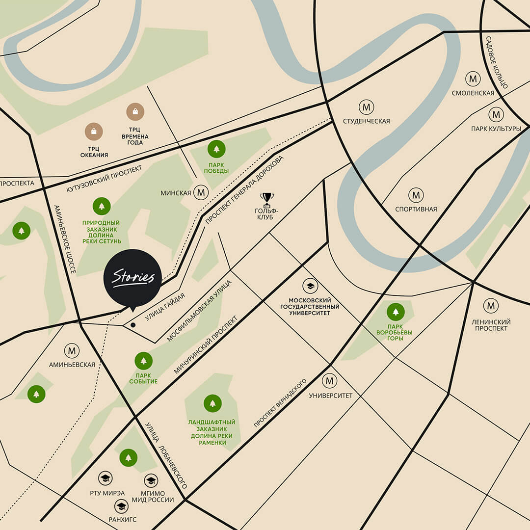 Жилой комплекс Stories расположен на одной из самых престижных улиц Москвы - на улице Мосфильмовская. На этой улице находятся главная кинематографическая площадка страны – киноконцерн Мосфильм, посольства целого ряда государств, многие премиальные жилые комплексы, а также Московский гольф-клуб.